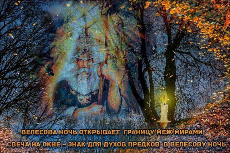 Когда наши предки были в затруднительном положении и не знали, как верно поступить, то они, перед сном, всегда мысленно просили помощи у умерших родственников. Для этого они приговаривали: «(Имя любого из умерших родственников), сегодня тебе в наш мир приходить, мне совет приносить. Подскажи, как мне быть, как и чем дело завершить». После чего задавили вопрос. Предки свято верили, что связываются со своими родными через сон, в котором обязательно увидят нужный и правильный совет. У этой ночи есть обряд для полезного знакомства, хотя, наши предки считали, что в этот день лучше вообще не знакомиться, так как новый человек принесет несчастья в судьбу. Однако, в жизни порой случается и так, что знакомства избежать не получалось. Чтобы не было беды и горя от такого знакомства, перед сном принято было проговорить: «Чур меня от знакомства дурного. Дай, Бог, мне друга золотого». Однако, чтобы эти слова сбылись нужно надеть ночную рубашку, пижаму или майку в которой собираетесь спать этой ночью, наизнанку. ЭЗОТЕРИЧЕСКОЕ ЗНАЧЕНИЕ ВЕЛЕСОВОЙ НОЧИ. Велесова ночь особенно интригует всех своей загадочностью. Именно, в это время открывается портал в потусторонний мир, стирается тонкая грань между нашим миром и царством духов. Мы, эзотерики подмечаем, всю эту прелесть уже с начала октября. Уникальную энергетику Велесовой ночи могут почувствовать все люди. Наши умершие близкие и знакомые приходят к нам во сне. В эту ночь им позволено навестить нас. Обычно умершие родственники во сне пугали и пугают до сих пор, однако, не в Велесову ночь. Ведь это испокон веков считалось добрым знаком, это значит, что они помогут вам в решении сложных вопросов. Вызывайте в своей памяти всех тех, кто уже ушёл в мир иной. Зажигайте вечером свечи. Вы можете почувствовать присутствие тех, кто был вам дорог, но их уже нет рядом с вами. Не надо пугаться их присутствия. Наоборот, пригласите их к своему огню. Может быть, они поделятся чем-то важным, дадут совет, или просто побудут недолго возле вас. Также, в ночь на 1 ноября, можно увидеть во сне одно из своих предыдущих воплощений, понять все странствия, и попробовать разобраться в задачах вашей души в этом воплощении. В Велесову ночь, как никогда, идёт борьба Света и Тьмы за нашу душу. Предки славяне были уверены в том, что каждый год, в этот день, все наши грехи взвешиваются, и даётся предварительное направление каждой человеческой грешной душе - в Рай или Ад. Ловушки и сети будут расставлены для нас в этот день на каждом шагу. Каждого из нас тёмные силы могут испытывать на прочность. Поэтому Велесова ночь для каждого человека - это время для очищения, осмысления, понимания и, возможно, перехода на новую духовную ступень. В этот праздник давайте постараемся насладиться каждым вкусом, каждым запахом и ощущением, каждым событием, произошедшим с нами. Прочувствуем, что «МЫ - ЖИВЫ». Пусть этот день станет праздником Живой Жизни. В эту ночь не отказывайте просящим вас людям о милости или помощи. По старинным правилам, заговоренных монет старались приготовить к этому празднику столько, чтобы хватило всем просящим. Для этого наши предки в кошельках собирали все мелкие деньги и говорили: «Пусть моя денежка поможет всякому, кто в ней нуждается. Вокруг обернется, а ко мне достатком вернется!». Всю заговорённую мелочь затем раздавали нищим. Наши предк